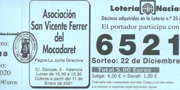 A partir del 19 de OCTUBRE venta de lotería de Navidad en la Llar de la calle Danzas 2. TODOS los LUNES Mañanas de 10,30 a 13,30 horas. Tardes de 5,30 a 7,30 horas.