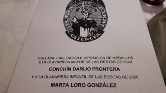 Nuestra Clavariesa Mayor, Carmen Tello Prades, asistió a la Exaltación e Imposición de medallas de las Clavariesas Mayor, Conchín Darijo Frontera, e Infantil, Marta Loro González, para el año 2020 del Altar del Carmen. En la primera parte del acto estuvo acompañada de nuestro Clavario Juvenil, Nacho Hueso Moll.